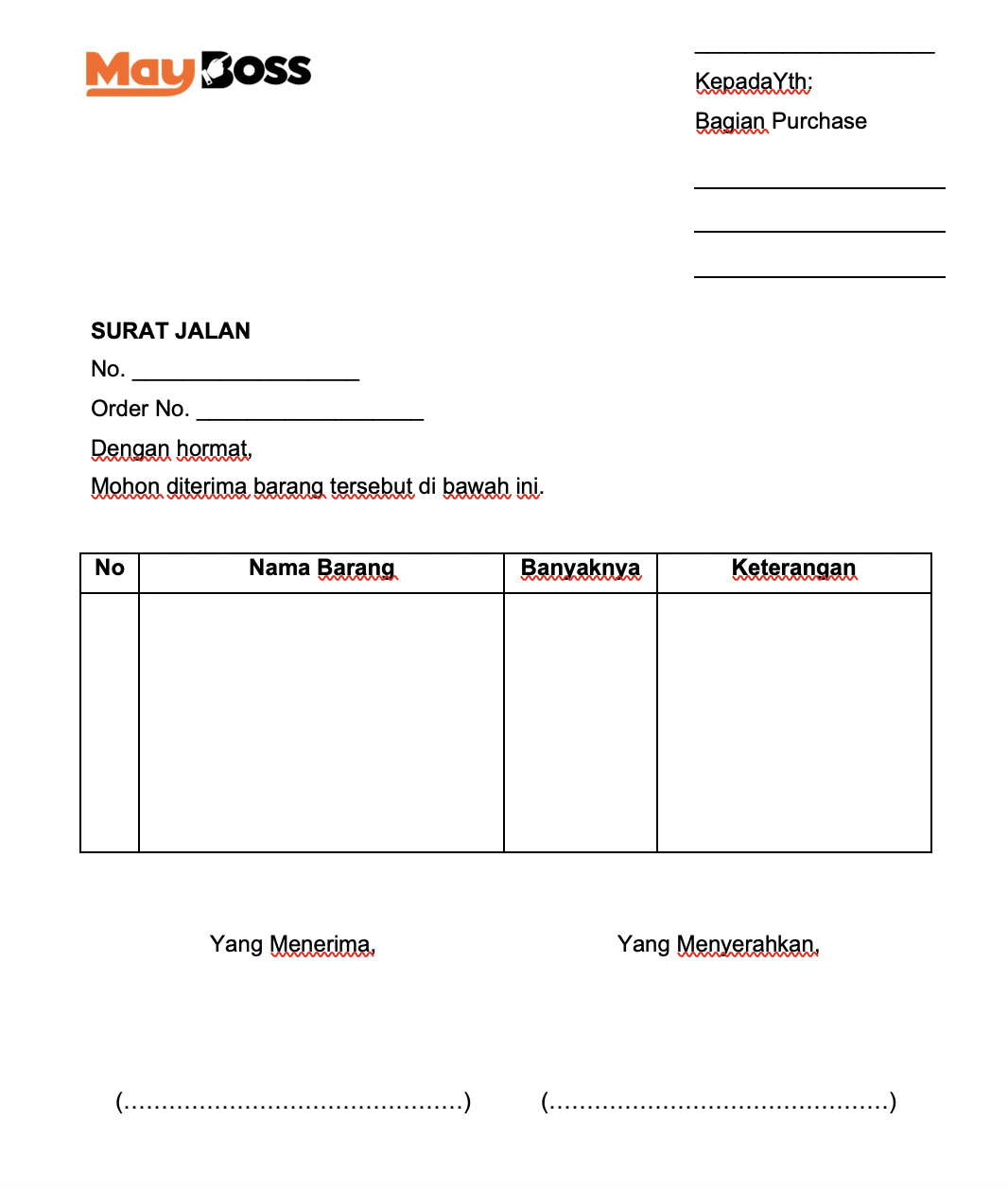 1. Nomor surat pengiriman barang sesuai yang telah dikeluarkan oleh pihak vendor.